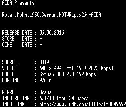 | FiLENAME: | Roter.Mohn.1956.German.HDTVRip.x264-AIDA.mkv |