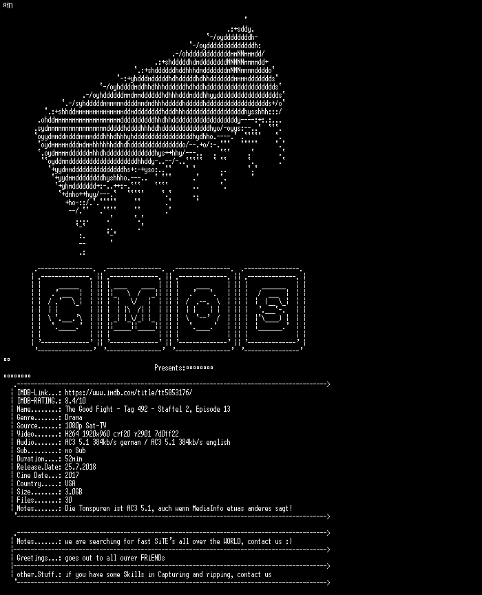 | FiLENAME: | The.Good.Fight.S02E13.Tag.492.GERMAN.DL.1080p.HDTV.x264-CMOS.mkv |