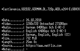 | FiLENAME: | Castlevania.S02E02.GERMAN.DL.720p.WEB.x264-EiSBOCK.mkv |