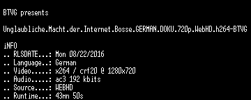 | FiLENAME: | Unglaubliche.Macht.der.Internet.Bosse.GERMAN.DOKU.720p.WebHD.h264-BTVG.mkv |