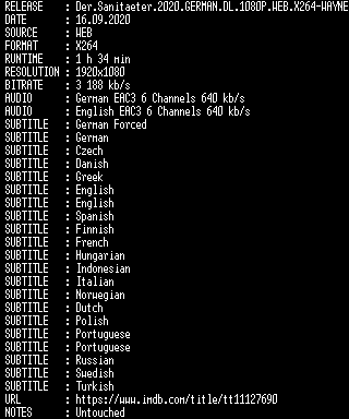 | FiLENAME: | Der.Sanitaeter.2020.GERMAN.DL.1080P.WEB.X264-WAYNE.mkv |