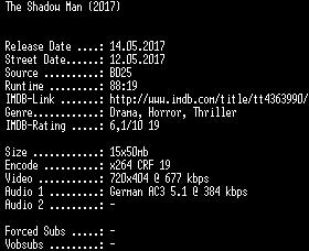 | FiLENAME: | The.Shadow.Man.German.2017.AC3.BDRip.x264-SPiCY.mkv |