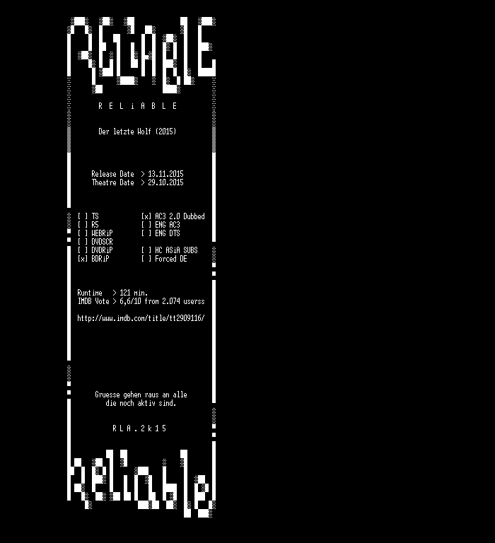 | FiLENAME: | Der.letzte.Wolf.BDRiP.MD.GERMAN.x264-RELiABLE.mkv |