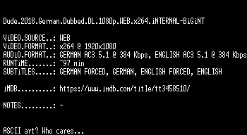 | FiLENAME: | Dude.2018.German.Dubbed.DL.1080p.WEB.x264.iNTERNAL-BiGiNT.mkv |