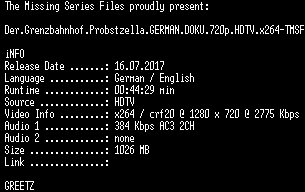 | FiLENAME: | Der.Grenzbahnhof.Probstzella.GERMAN.DOKU.720p.HDTV.x264-TMSF.mkv |