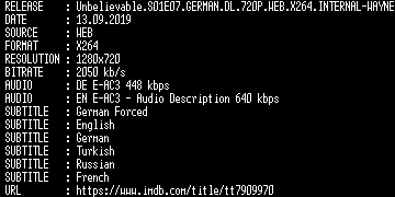 | FiLENAME: | Unbelievable.S01E07.GERMAN.DL.720P.WEB.X264.INTERNAL-WAYNE.mkv |