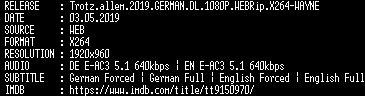 | FiLENAME: | Trotz.allem.2019.GERMAN.DL.1080P.WEBRip.X264-WAYNE.mkv |