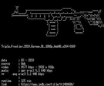 | FiLENAME: | Triple.Frontier.2019.German.DL.1080p.WebHD.x264-GSG9.mkv |