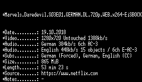 | FiLENAME: | Marvels.Daredevil.S03E01.GERMAN.DL.720p.WEB.x264-EiSBOCK.mkv |