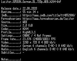 | FiLENAME: | Lucifer.S05E06.German.DL.720p.WEB.h264-WvF.mkv |