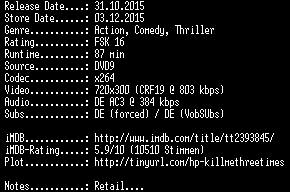 | FiLENAME: | Kill.Me.Three.Times.Man.stirbt.nur.dreimal.2014.German.AC3.DVDRip.x264-HP.mkv |