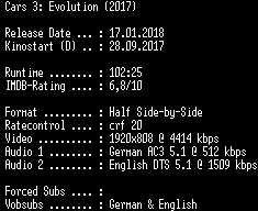 | FiLENAME: | Cars.3.Evolution.3D.HSBS.2017.German.DL.1080p.BluRay.x264-COiNCiDENCE.mkv |