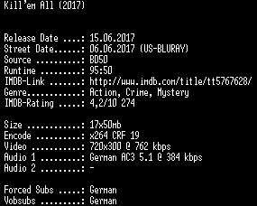 | FiLENAME: | Kill.Em.All.German.2017.AC3.BDRip.x264-SPiCY.mkv |