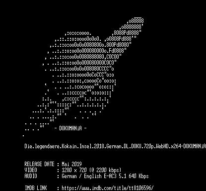 | FiLENAME: | Die.legendaere.Kokain.Insel.2018.German.DL.DOKU.720p.WebHD.x264-DOKUMANiA.mkv |