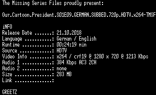 | FiLENAME: | Our.Cartoon.President.S01E09.GERMAN.SUBBED.720p.HDTV.x264-TMSF.mkv |