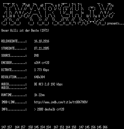 | FiLENAME: | Unser.Willi.ist.der.Beste.1971.German.DVDRip.x264.iNTERNAL.RERiP-TVARCHiV.mkv |