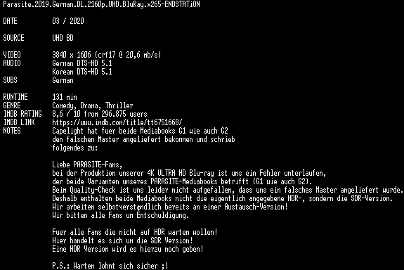 | FiLENAME: | Parasite.2019.German.DL.2160p.UHD.BluRay.x265-ENDSTATiON.mkv |