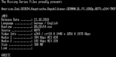| FiLENAME: | American.Dad.S03E04.Hauptsache.Republikaner.GERMAN.DL.FS.1080p.HDTV.x264-TMSF.mkv |