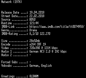 | FiLENAME: | Network.German.REMASTERED.1976.AC3.BDRip.x264-SPiCY.mkv |