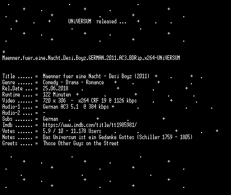 | FiLENAME: | Maenner.fuer.eine.Nacht.Desi.Boyz.GERMAN.2011.AC3.BDRip.x264-UNiVERSUM.mkv |