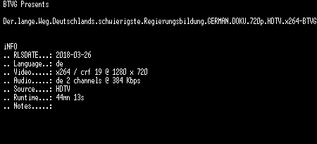 | FiLENAME: | Der.lange.Weg.Deutschlands.schwierigste.Regierungsbildung.GERMAN.DOKU.720p.HDTV.x264-BTVG.mkv |