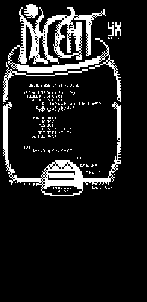 | FiLENAME: | Zweimal.Sterben.ist.Einmal.zuviel.German.2010.DVDRip.XviD-DECENT.avi |