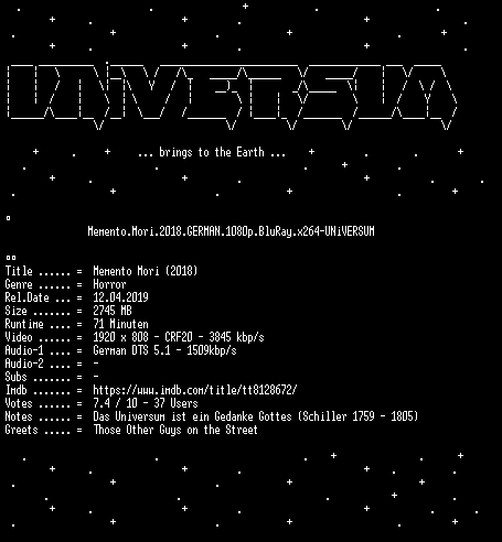| FiLENAME: | Memento.Mori.2018.GERMAN.1080p.BluRay.x264-UNiVERSUM.mkv |