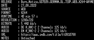 | FiLENAME: | Burn.Notice.S07E09.GERMAN.DL.720P.WEB.X264-WAYNE.mkv |