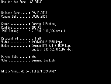 | FiLENAME: | Das.ist.das.Ende.German.DL.1080p.BluRay.x264-EXQUiSiTE.mkv |