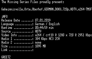 | FiLENAME: | Geheimnisvolle.Orte.Oberhof.GERMAN.DOKU.720p.HDTV.x264-TMSF.mkv |