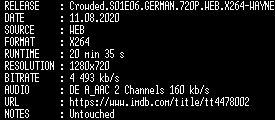 | FiLENAME: | Crowded.S01E06.GERMAN.720P.WEB.X264-WAYNE.mkv |