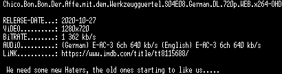 | FiLENAME: | Chico.Bon.Bon.Der.Affe.mit.dem.Werkzeugguertel.S04E08.German.DL.720p.WEB.x264-OHD.mkv |