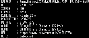 | FiLENAME: | Burn.Notice.S07E10.GERMAN.DL.720P.WEB.X264-WAYNE.mkv |
