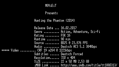 | FiLENAME: | Hunting.the.Phantom.German.2014.AC3.BDRip.x264-MOViEiT.mkv |