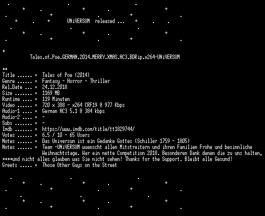 | FiLENAME: | Tales.of.Poe.GERMAN.2014.MERRY.XMAS.AC3.BDRip.x264-UNiVERSUM.mkv |