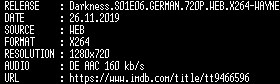 | FiLENAME: | Darkness.S01E06.GERMAN.720P.WEB.X264-WAYNE.mkv |