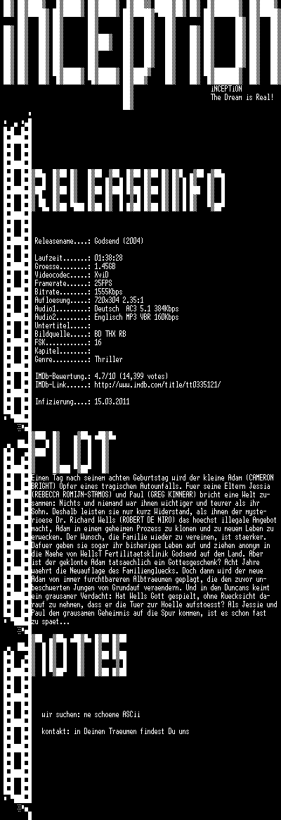 | FiLENAME: | Godsend.2004.German.AC3.DL.BDRip.XviD-iNCEPTiON.avi |