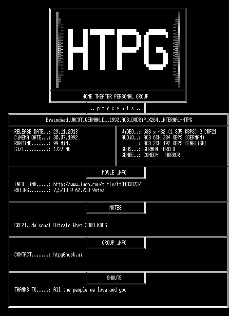 | FiLENAME: | Braindead.UNCUT.GERMAN.DL.1992.AC3.DVDRiP.X264.iNTERNAL-HTPG.mkv |