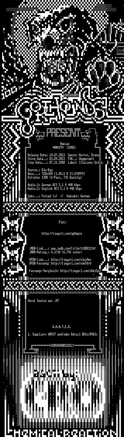 | FiLENAME: | Maniac.UNCUT.REMASTERED.GERMAN.1980.DL.AC3.BDRiP.XViD-GOREHOUNDS.avi |