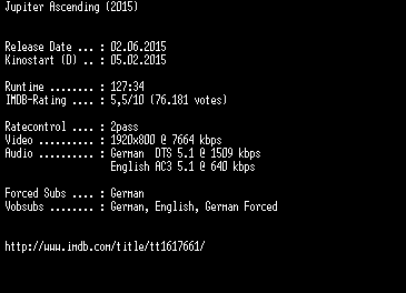 | FiLENAME: | Jupiter.Ascending.2015.German.DL.1080p.BluRay.x264-EXQUiSiTE.mkv |