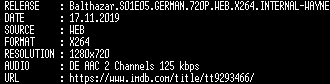 | FiLENAME: | Balthazar.S01E05.GERMAN.720P.WEB.X264.INTERNAL-WAYNE.mkv |