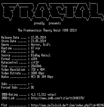 | FiLENAME: | The.Frankenstein.Theory.Uncut.German.2013.AC3.BDRip.x264-FRACTAL.mkv |