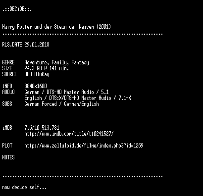 | FiLENAME: | Harry.Potter.und.der.Stein.der.Weisen.2001.GERMAN.DL.2160p.UHD.BluRay.x265-DECiDE.mkv |