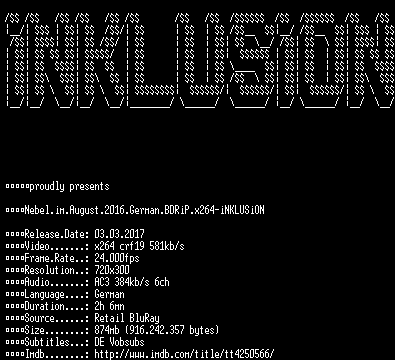 | FiLENAME: | Nebel.im.August.2016.German.BDRiP.x264-iNKLUSiON.mkv |