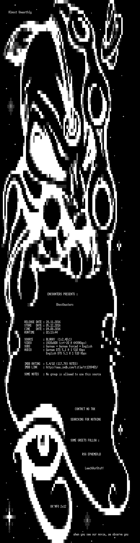 | FiLENAME: | Ghostbusters.EXTENDED.2016.German.DL.1080p.BluRay.x264-ENCOUNTERS.mkv |