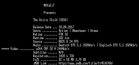 | FiLENAME: | The.Osiris.Child.2016.German.DL.1080p.BluRay.x264-MOViEiT.mkv |