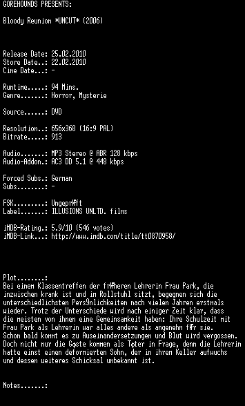 | FiLENAME: | Bloody.Reunion.UNCUT.German.2006.DVDRiP.XViD-GOREHOUNDS.avi |