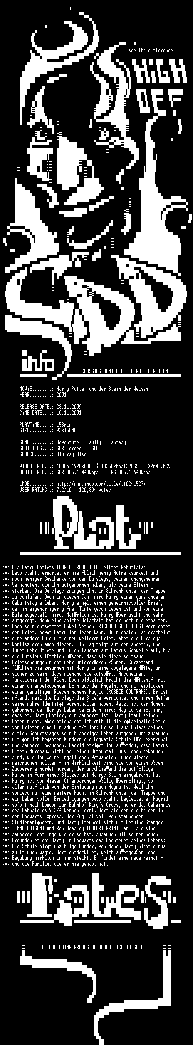 | FiLENAME: | Harry.Potter.1.-.Harry.Potter.und.der.Stein.der.Weisen.Extended.Version.2001.German.DL.1080p.BluRay.x264-CDD.mkv |