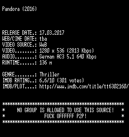 | FiLENAME: | Pandora.2016.German.720p.WebHD.x264-SLG.mkv |
