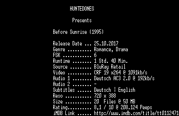 | FiLENAME: | Before.Sunrise.German.1995.REMASTERED.AC3.BDRip.x264-HUNTEDONES.mkv |